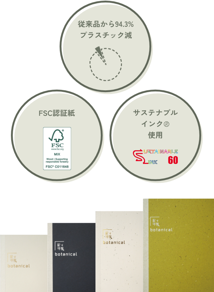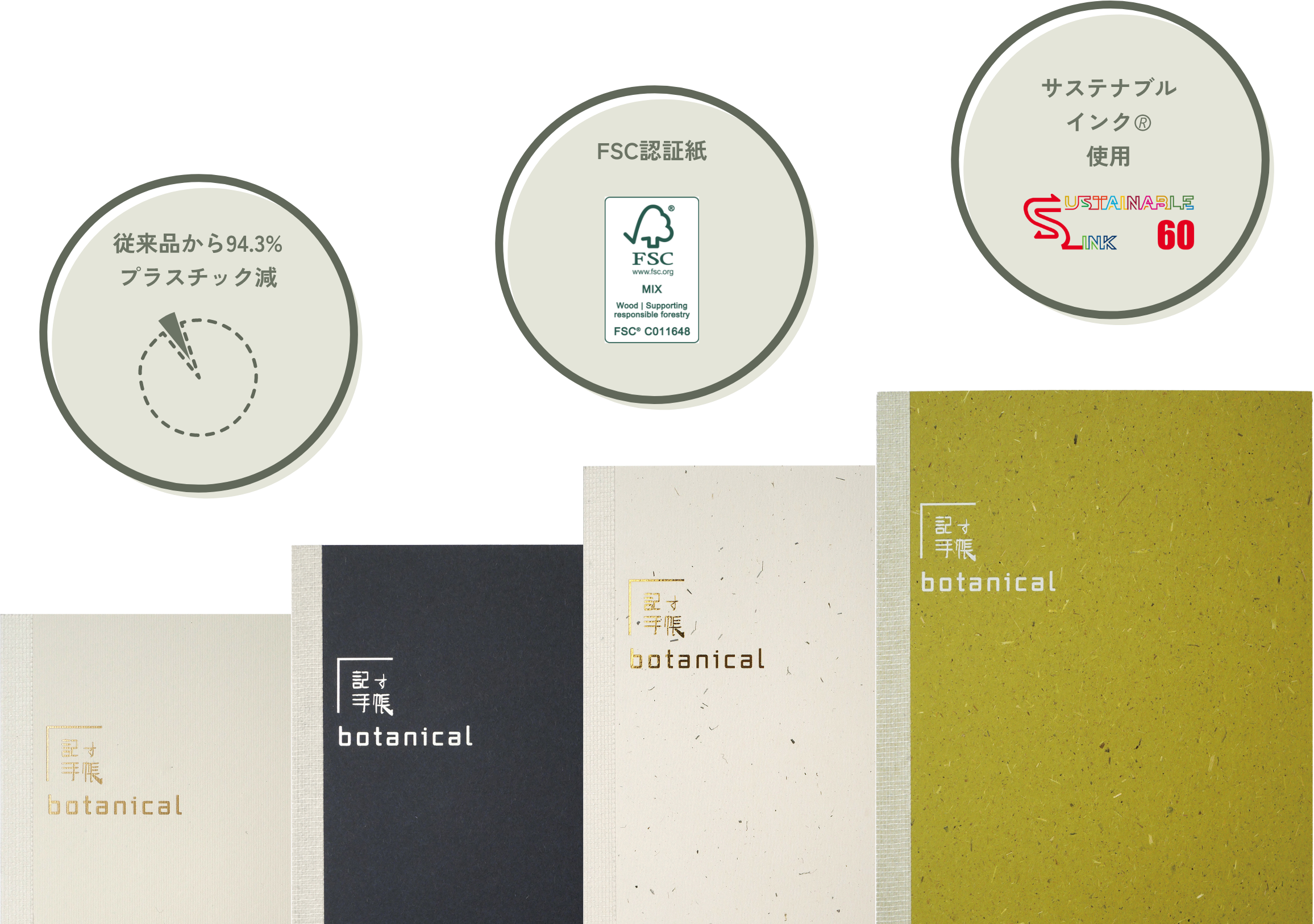 従来品のプラスチック成分53g程度に対し、記す手帳botanicalのプラスチック成分は3g程度に抑えております。その他にもサステナブルインク🄬、FSC認証紙を使用し、環境に配慮した素材にこだわり抜いて作りました。